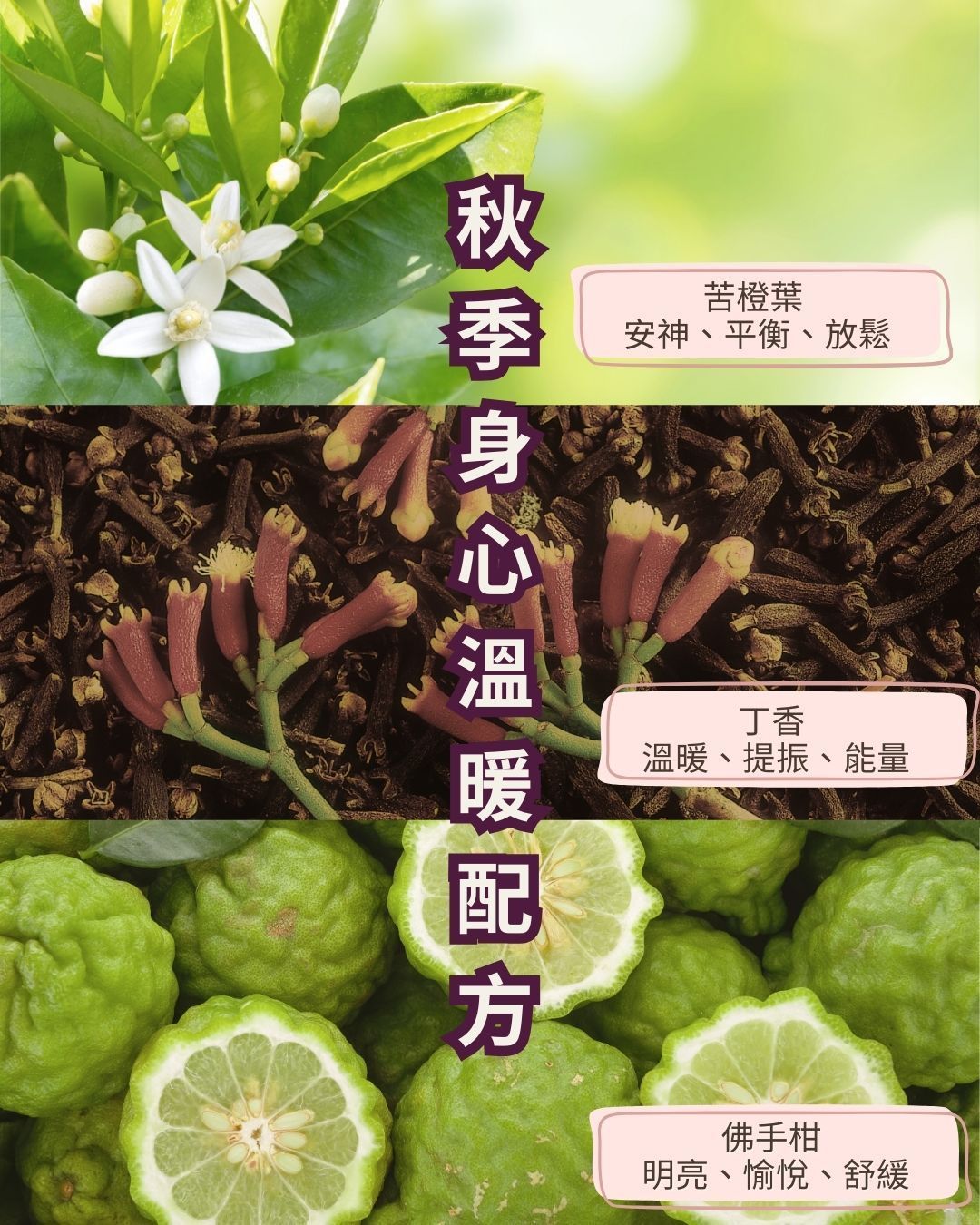 當秋風吹起,天氣逐漸轉涼,白天與夜晚的溫差也越來越明顯。這樣的季節裡,身心常常會感到有些疲倦與緊繃。若能透過芳香療法的幫助,不僅能為日常帶來溫暖的氣息,也能安撫情緒,讓自己更自在地迎接秋天的節奏。 芙樂思特別為大家調配了一款 #秋季身心溫暖配方 ,只要簡單三滴,就能為生活注入貼心與療癒的能量。 🥣 配方調理建議 佛手柑 5滴 苦橙葉 2滴 丁香 1滴 🌿 單方精油特色 佛手柑 帶有明亮清新的果香,如同秋日晨光般溫柔。它能舒緩情緒、減輕壓力,帶來一份愉悅與放鬆感,幫助你找回內心的輕盈。 苦橙葉 散發淡淡的綠葉氣息,有助安神與穩定情緒。當它與佛手柑搭配時,更能讓心情獲得平衡,彷彿把日常的緊繃慢慢釋放。 丁香 溫暖的辛香氣息帶來暖身與提振效果,特別適合初秋微涼的天氣。它能幫助活絡身體能量,讓人感覺由內而外都暖了起來。 🌸 日常使用方式 1️⃣ 居家擴香 將配方滴入擴香器中,於早晨或夜晚擴香 10–15 分鐘。溫暖而柔和的香氣,會悄悄填滿空間,帶來安心與舒適。 2️⃣ 芳香按摩 取基底油 10ml,加入配方精油混合後,輕輕按摩手腕、肩頸或後背。能幫助放鬆緊繃的同時,也溫潤肌膚,帶來暖意十足的呵護。 3️⃣ 秋日泡澡 在溫水浴中加入精油配方,浸泡其中,讓香氣隨蒸氣瀰漫全身,感受被溫暖包覆的療癒時光。 🍁 給自己的貼心時刻 這個小巧的秋季配方,不只是迷人的香氣,更是陪伴。它能在日漸轉涼的季節裡,幫助我們保持身心的舒適與平衡,讓秋日生活多一份柔軟的溫暖。 不妨在日常裡安排一個屬於自己的「秋日暖心儀式」,讓身體與心靈都在香氣中慢慢放鬆。